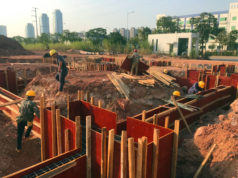 瑞聲南寧光學(xué)項目主產(chǎn)高精密手機鏡頭,包括一體式VCM雙攝、晶圓級玻璃(WLG)鏡頭、玻塑混合鏡頭等,是瑞聲核心技術(shù)之一,項目的盡快投產(chǎn)對于瑞聲公司在美國打壓中國通訊產(chǎn)業(yè)的大環(huán)境下?lián)屨籍a(chǎn)業(yè)鏈轉(zhuǎn)移先機,搶占市場份額;經(jīng)開區(qū)落實自治區(qū)強首府戰(zhàn)略、打造千億產(chǎn)業(yè)園等都有著十分重要的意義,是一個多贏格局。項目計劃2020年2月上旬正式投產(chǎn)。榮鑫公司在該項目中主要承擔(dān)附屬工程施工,包括設(shè)備用房、污水處理廠房、危品庫、空壓機房主體施工及園區(qū)道路、綠化等,是名符其實的配角,但在項目的前期階段,聚光燈卻始終照在這“配角”的身上。附屬工程中,設(shè)備用房、污水處理廠房等建筑面積共4000平方米,是項目裝修、安裝的基礎(chǔ)工程,投產(chǎn)倒排工期要求2019年12月25日前必須完成并交付安裝單位(道路綠化等配合項目總進(jìn)度,不在此列),工期不足三個月!該部分用房面積雖不大,且大部分只有兩層,但由于特殊設(shè)計要求且項目處回填區(qū)域,涉及樁基、深基坑(5.5米)、高支模(8.3米)、防滲防腐等土建施工難點、費時點,不可控因素多,給工程按期完工帶來了極大的困難。該部分項目工程量不大,與后期裝修、安裝關(guān)系密切,本應(yīng)由裝修總包單位統(tǒng)一施工,但裝修單位一再推托,坦言不可能完成。最終管委將此部分項目授與了榮鑫公司。此時,裝修、安裝單位在觀望,業(yè)主、建設(shè)主管部門也都在捏把汗。